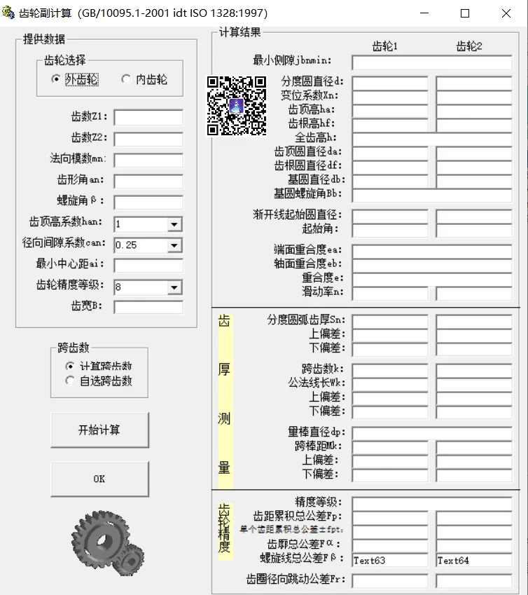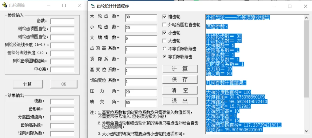 基本上齿轮计算涉及参数:大齿轮齿数、小齿轮齿数、大端模数、齿顶高系数、顶隙系数、高变位系数、切向变位系数、压力角、轴交角、大端分度圆直径、分度锥角、大端锥距、大端齿距、大端齿顶高、大端齿根高、大端全齿高、大端齿顶圆直径、冠顶距、齿根角、无根切许用最大齿根角、齿顶角、顶锥角、根锥角、大端分度圆弧齿厚、大端分度圆弦齿厚、大端分度圆弦齿高、刨齿机用的齿角等