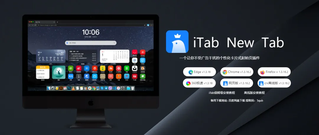 iTab 是一款为 PC 端浏览器开发的启动页插件,兼容Chrome、微软Edge、Firefox、360极速等大家常用的PC端浏览器,此外它也有网页版。特色是无广告、类iOS小组件卡片风格、高颜值UI。