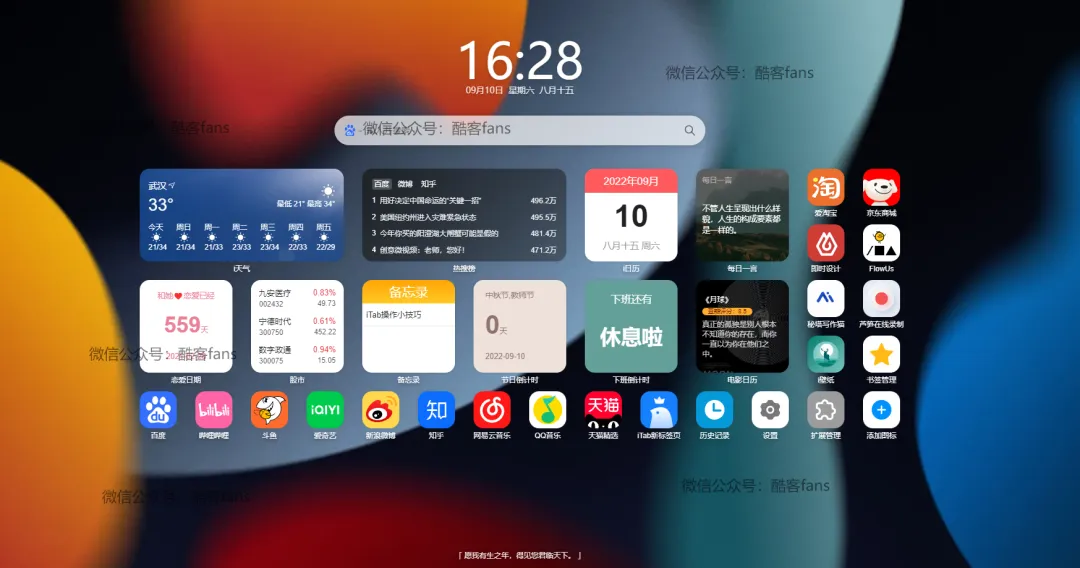 安装插件并重新载入浏览器启动页之后,就可以看到iTab了。整体的UI颜值还算不错,你可以自定义网站图标样式和布局、自定义常用搜索引擎以及搜索引擎的样式。除了常用的网站书签,其还提供了天气/万年历/备忘录/壁纸/一言/IP查询/每日热点等原创应用插件,通过小组件卡片的方式显示在主页上。