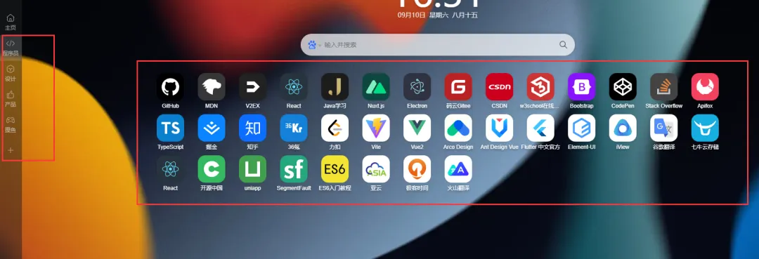 此外,作者还贴心的在左侧为程序员、设计师、产品经理等用户群体做了一些常用网站的集合,较为全面,还有常用摸鱼网站合集,可以说对打工人极其友好了。