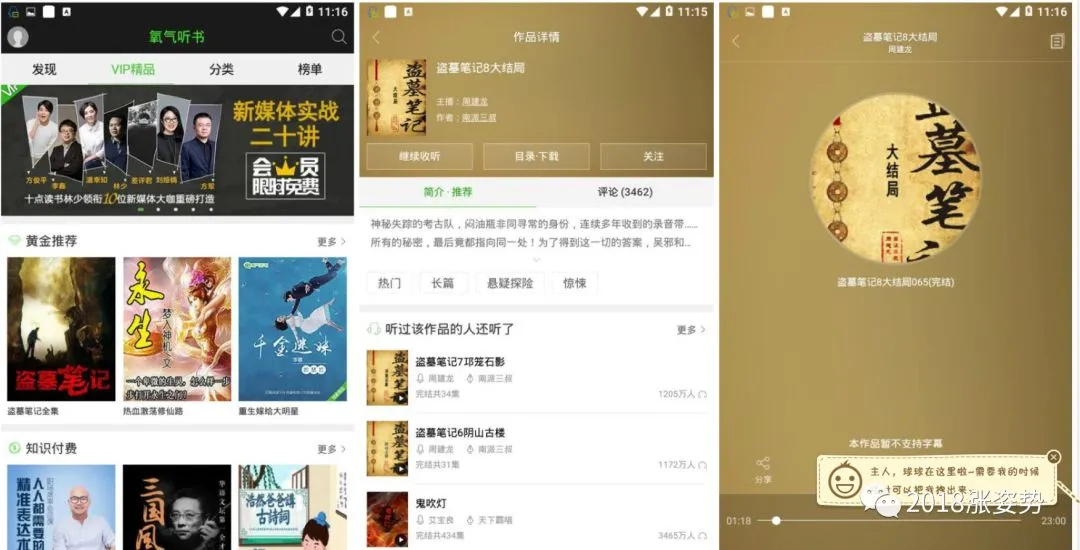 氧气听书是国内大型正版有声书库(海量免费、正版高清),二十万小说作品,二十个大类,全方位满足听书需求,并提供媲美CD音质的高保真收听体验。 拥有超20万小时,5万部作品的正版有声阅读内容,有声小说、文史经典、经管励志、育儿宝典、评书相声、综艺搞笑等。
