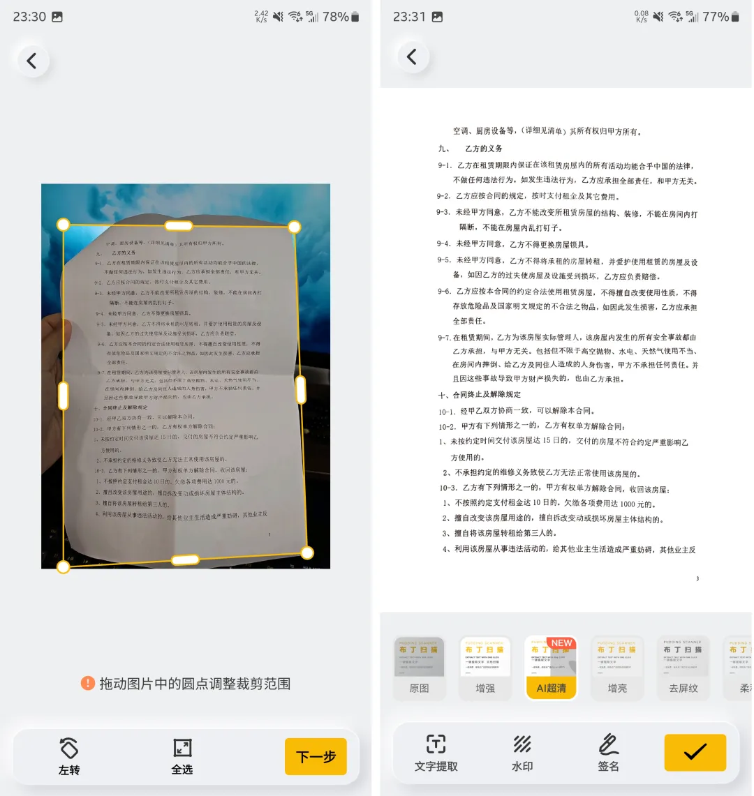 更加便捷的是,它的“AI超清”滤镜同时还能做到文档矫正、去除阴影/褶皱/透字效果,即使是饱经风霜的文件,也能焕发新生。你看我这皱巴巴的原文件,经过扫描之后简直完好无损了: