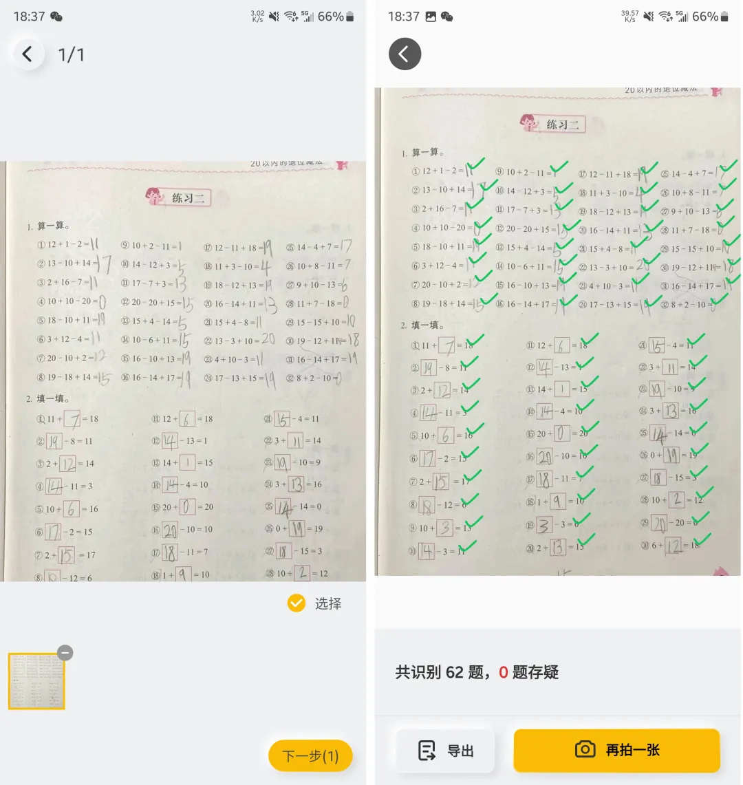 对于小学一二三年级的算术题,布丁扫描还有个“口算批改”的功能,只需要对准练习题拍照,app 就会自动帮你判断对错并圈出错题,点击还能查看正确答案,家长检查作业是不是省了不少时间?