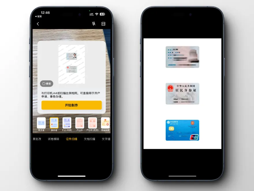 布丁扫描支持扫描身份证、银行卡、户口本、驾照、营业执照等各种证件,然后直接导出为 PDF 或 JPG 格式。和其他 app 的简单扫描做对比,布丁扫描还可以做到通过打印机打印 A4 纸时,保持图像和证件大小一致,而且还可以实现身份证正反面+银行卡这种三拼拼图方式,如果需要开户申请、事务办理的,能提高不少效率。