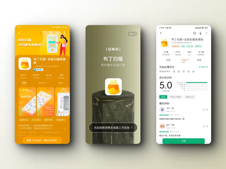 在安卓端市场,各大品牌应用商店内评分均在4.9分以上,还获得华为官方“每日推荐”、vivo“极光奖”、小米“金米奖”、OPPO“至美奖”等多个奖项,扫描类软件天花板实至名归了。