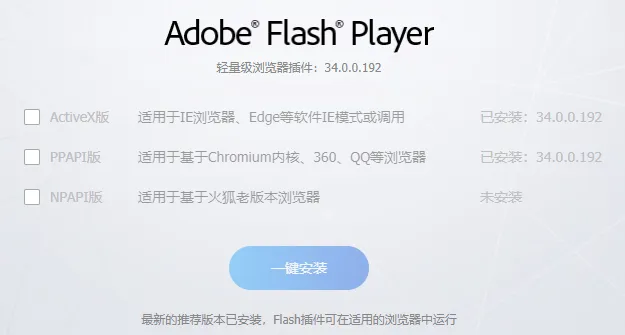 这款纯净版Flash,已经集成了这三个版本,所以只要你是Windows系统,装上它就没问题。