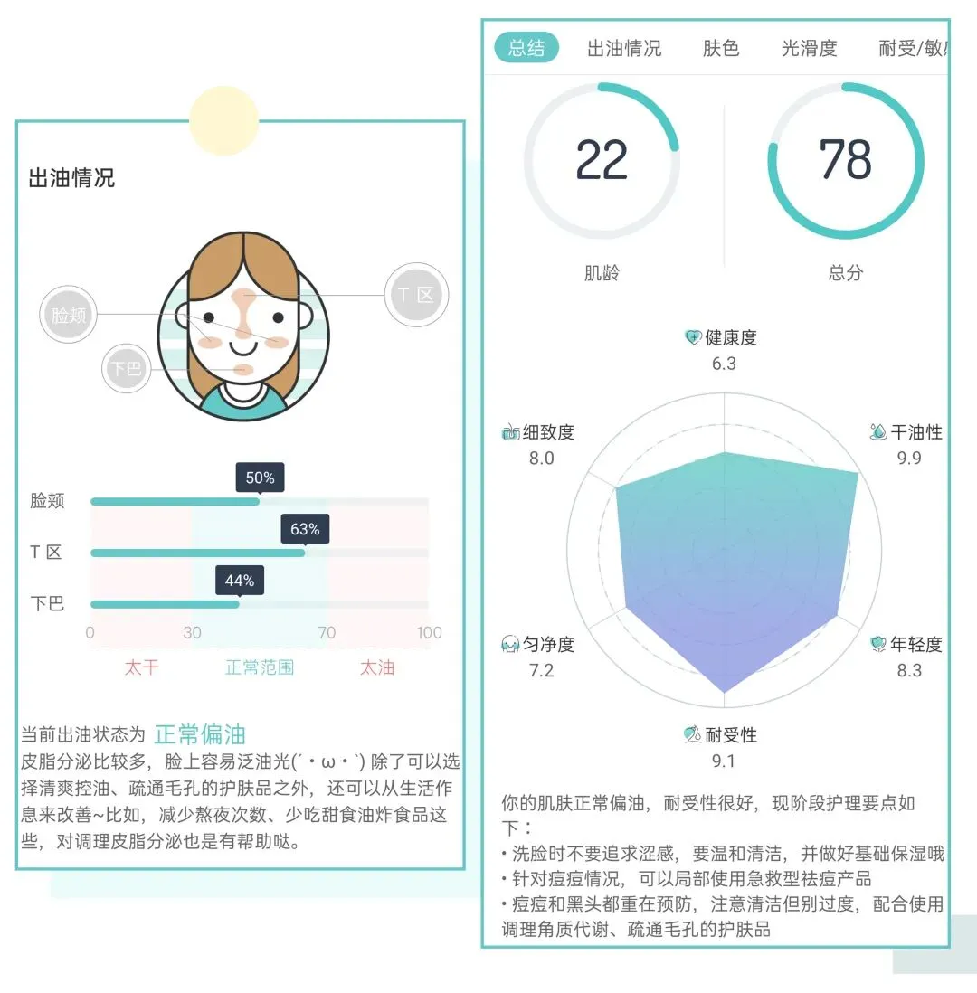 个人认为功能还是比较强大的,可以检测你黑眼圈周围的色素沉淀、脸部的出油状况、光滑度、黑头等问题。简直不要太贴心👍。