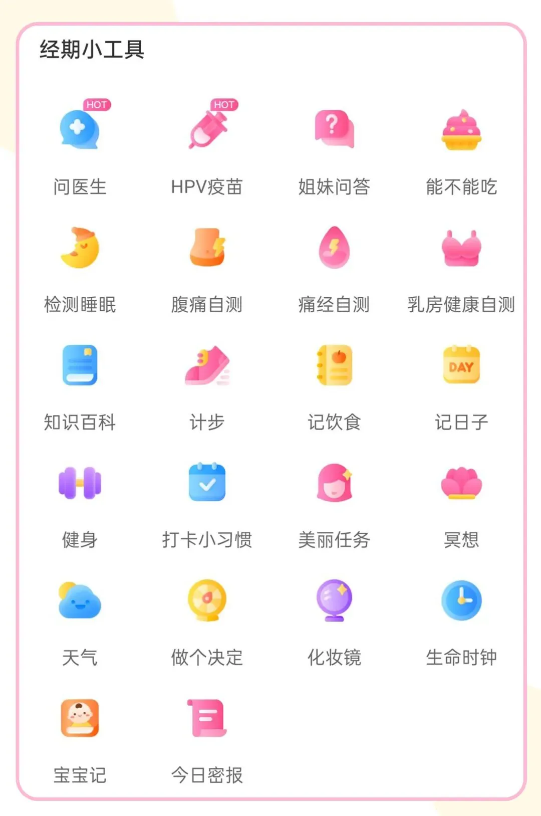 还有就是一些经期小工具,比如HPV疫苗、经期能吃什么、运动等都是比较实用的小工具。姐妹们可以根据需求用这些工具,后台会自动保存你的数据,然后累积经验,方便更好地测出你的经期状况。