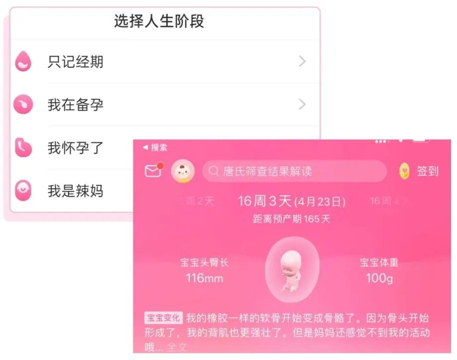 APP可以选择当前的女性状态,跳出来的界面自然也是不一样。如果你是怀孕期间的姐妹,打开后,会有关于宝宝👶成型的一个科普。