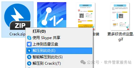 第九步:返回解压的安装包位置,找到Crack文件,右击解压到此处。【注,此步一定要退出杀毒软件,本机自带的杀毒最好退出,或是提示病毒的时候,允许运行】