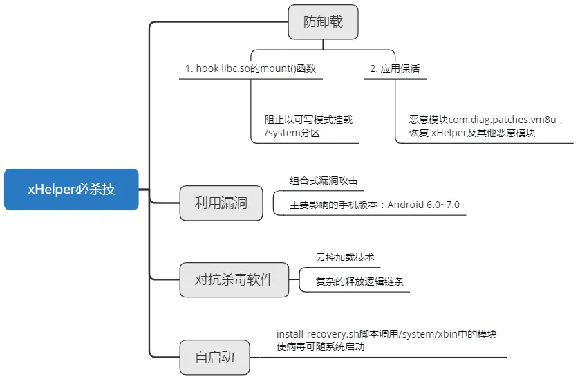 为了突破Android系统安全机制,获得ROOT权限,该病毒就利用了MTK芯片漏洞(CVE-2020-0069)、水滴漏洞(CVE-2019-2025)等多个Android系统漏洞进行肆意作恶。而为了增强隐蔽性和防卸载能力,其更是通过用病毒模块替换系统文件,并保证系统正常运行的升级技术,大大增加了查杀难度。如果用户删除病毒模块,无疑将直接导致系统崩溃;反之,病毒则将持续作恶。而为进一步增强存活能力,其同时还使用了蛇皮走位式的复杂释放链条及云控加载技术,以保证最终恶意模块顺利的落地执行。