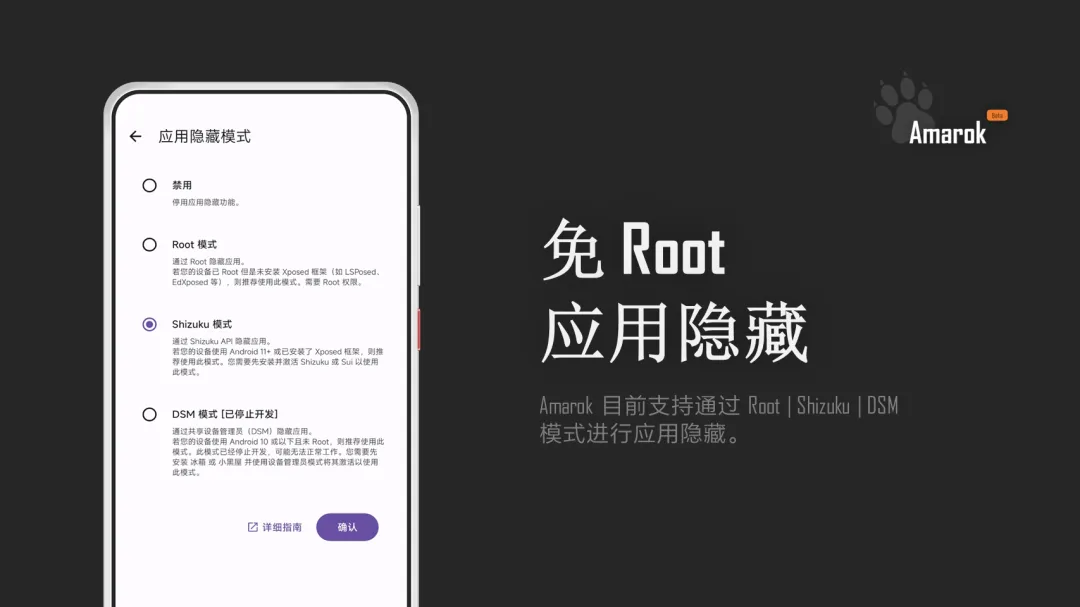 多模式免Root应用隐藏:支持 Shizuku、DSM 等模式隐藏应用。
