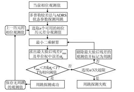 1) 采用ADRS和多普勒较差法(相位导出的多普勒与实际多普勒值之差)对当前历元的相位观测值进行周跳初步探测。当ADRS被标识为4时,表示相位跟踪失锁; 当多普勒较差小于给定阈值0.75 m时,认为未发生周跳,否则将其标记为周跳。