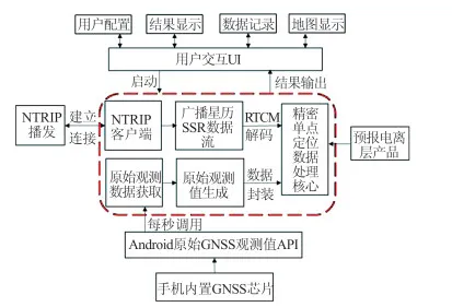 外部数据流的传输部分包括NTRIP(networked transport of RTCM via internet protocol)传输的RTCM(radio technical commission for maritime services)格式的广播星历和SSR改正数据以及调用Android应用框架API获得的GNSS观测数据,对于单频PPP定位,可事先下载预报的全球电离层格网模型。
