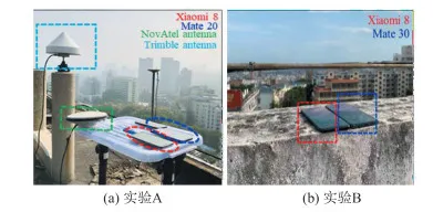 采用静态模拟动态的方式验证算法的正确性,两次静态实验的GNSS数据采集场景如图 3所示。实验A采集于湖北省武汉市某实验大楼楼顶,实验手机为Xiaomi 8和Huawei Mate 20,测量时手机正面朝上固定于观测台上。在手机旁架设有NovAtel-704-WB天线,其连接的是Septentrio PolaRx 5S测地型接收机,用于计算手机的坐标参考真值。两台手机至NovAtel天线的距离已事先量取,并进行了相应的距离改正。