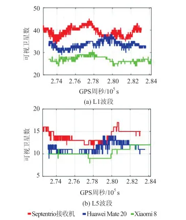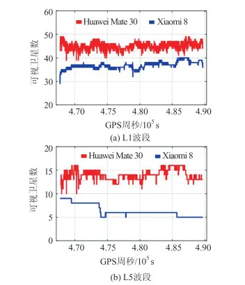 图 5 实验B中手机跟踪的L1波段和L5波段的可视卫星数