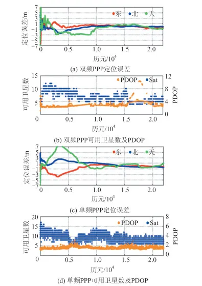对于单频PPP中的电离层延迟误差,采用预报的全球电离层格网模型进行改正,其精度约为0.3 m。对流层延迟干分量采用萨斯塔莫宁(Saastamoinen)模型改正,湿分量附加参数进行估计。接收机端的硬件延迟偏差可被接收机钟差吸收,而卫星端的硬件延迟偏差可被模糊度参数吸收,故在PPP浮点解时可不顾及硬件延迟偏差。