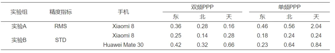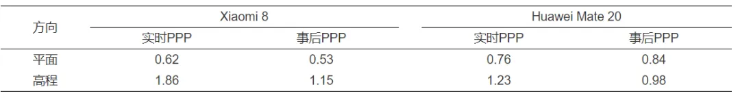 在定位性能评估方面,文献[12]使用Xiaomi 8手机进行双频PPP和实时动态定位(real time kinematic,RTK)测试,其精度仅为米级。