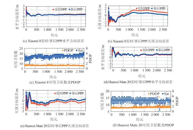 图 9 Xiaomi 8和Huawei Mate 20实时和事后单频PPP的定位误差、可用卫星数及PDOP