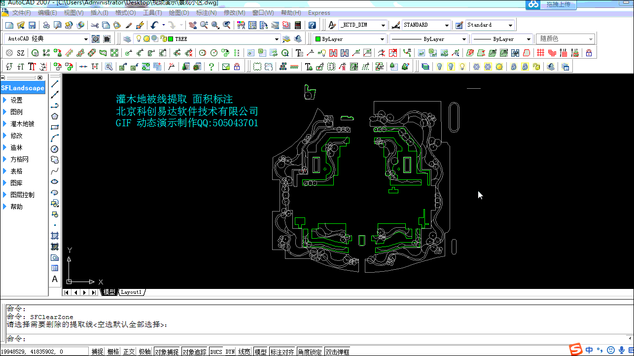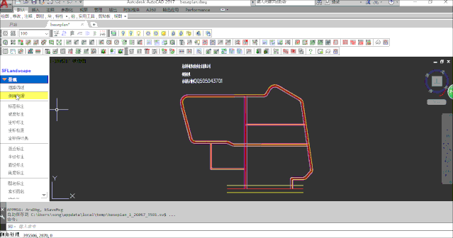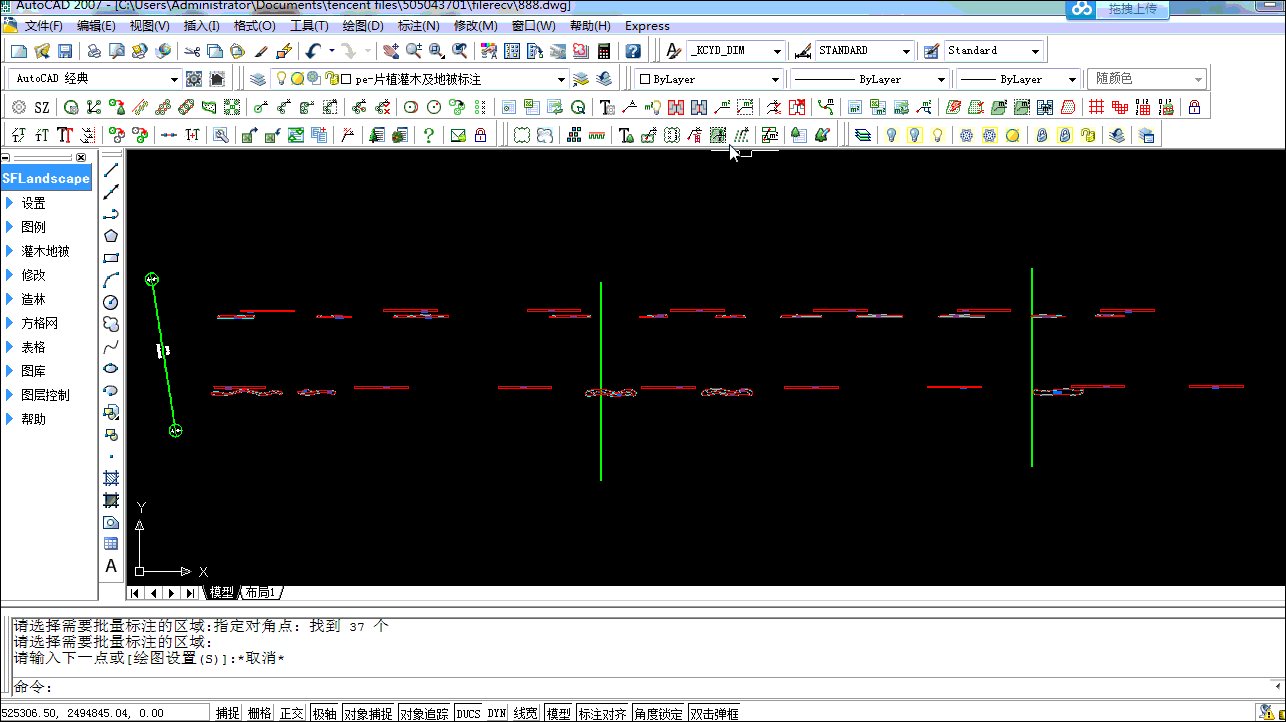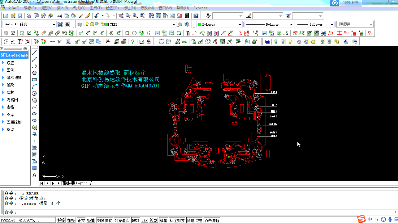 16. 提取灌木地被区域:针对多根PL线交叉闭合形成的区域,软件自动描取闭合线,红色显示。方便计算区域面积并标注。图纸内容多时也可以部分提取以提高工作效率。