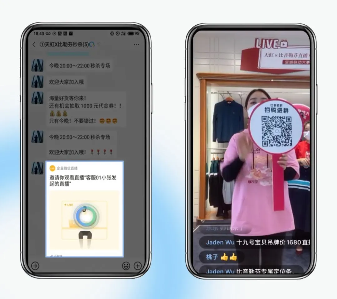 再以直播为例,企业微信群聊中的一个新功能 ——「群直播」,人人都可以直接发起直播,不需要麦克风、电脑,一台手机就能开播。以至于许多人的第一场直播就是在企业微信发起的,直接分享到微信群就可以开始线上教学、培训、甚至直播带货。天虹数字化经营中心总经理谭晓华在《第一财经》的企业抗疫生存指南栏目中,分享过天虹依托企业微信实现的线上业务的经验。其中就包括导购通过群直播,一个导购单场可以完成几十甚至近百万的成交额,搭配客户群、客户朋友圈等功能,天虹已经添加并服务了 550 万的微信上的顾客。
