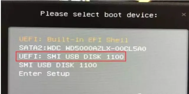 3、用键盘上的上下移动键选择UEFI:【SMI USB DISK 1100】后,按键盘上的Enter键。