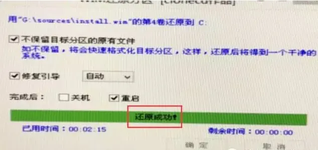 8.等显示还原成功后,电脑就会重启,此时要拔掉U盘和一切相关的外部设备,安装完成后,电脑会重新启动数次,在这期间【不用操作什么】,直到下一步。