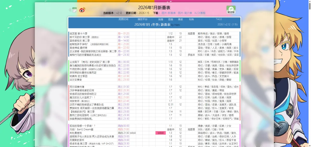 它不仅告诉你什么时候播,还通过不同版本的表格(预览版、完整版、下载版)满足你看、存、查的所有需求。覆盖从 2023 年的老番到 2026 年的超前瞻资讯,一年四季(冬、春、夏、秋)绝不掉队。