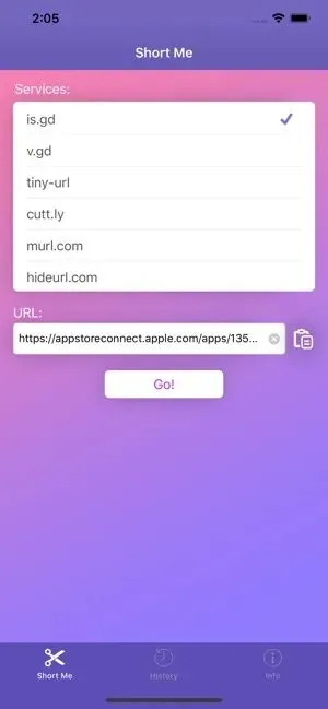 短评: 一款短网址生成器,使用的方式很简单,只要复制长网址,之后选择你要的服务商,贴上后再按「 Go 」即可生成短网址。