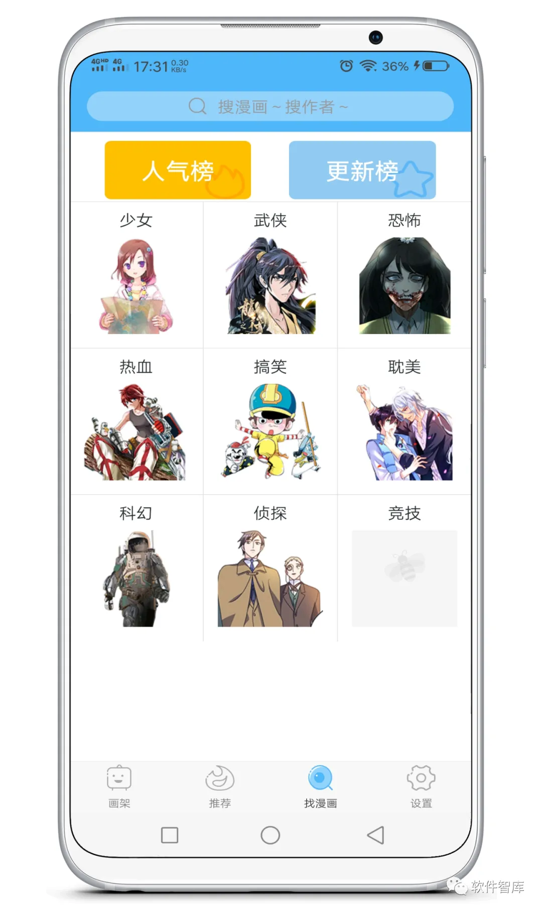 软件分类清晰,无论你喜欢武侠恐怖还是热血科幻搞笑等漫画,它都能满足到你的需求,还支持搜索,直接输入漫画名或作者等关键字即可;
