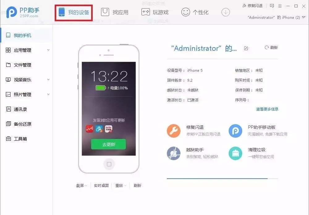 2.手机连接PP助手,点击我的设备。