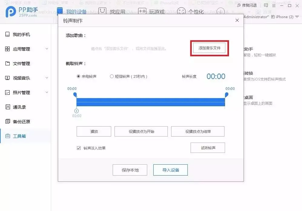 4.出现铃声制作页面,点击“添加音乐文件”。