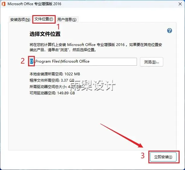 6.①点击【文件位置】,②把字符C改成D,③点击【立即安装】
