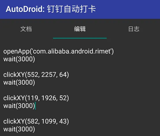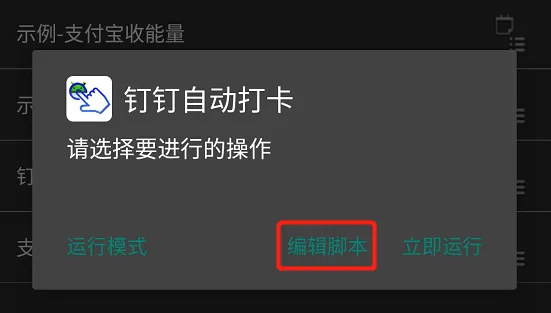 首先进入到它的脚本编辑模式,手动添加开启钉钉 App 的操作。