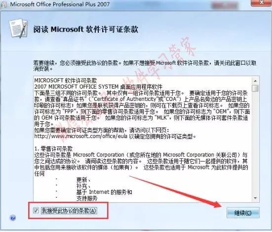 4、Office2007软件安装许可协议,勾选我接受,点击”继续“如下图: