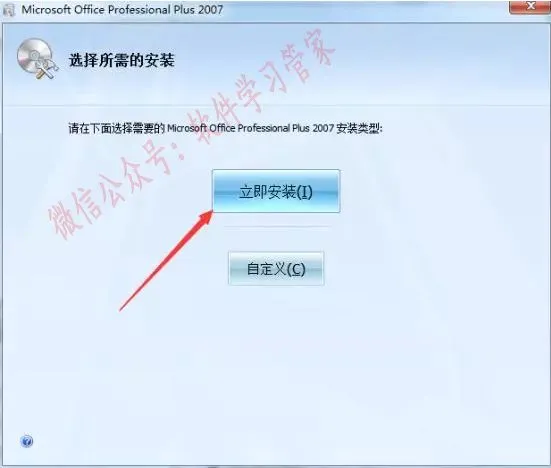 5、选择Office2007安装类型点击立即安装,也可以“自定义”安装,如下图: