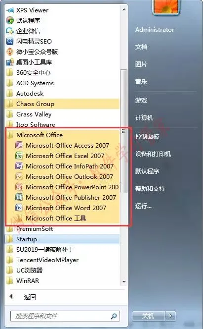 8、在“开始”菜单里面可以看到Office2007所有组件,如下图: