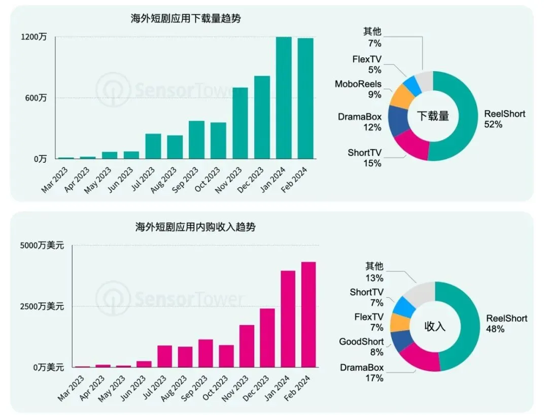 短剧出海热度近半年来持续攀升。Sensor Tower数据显示,截至2024年2月底,已有多达40多款短剧应用试水海外市场,累计下载量近5500万次,内购收入达到1.7亿美元。 (来源:新浪财经)