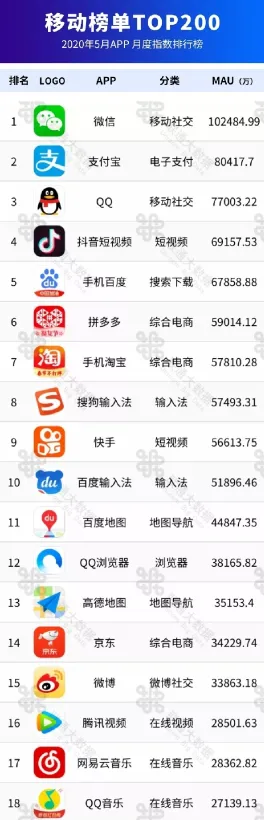 近日,中国联通发布了2020年5月app月度指数排行榜: