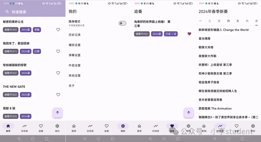 软件首页主要分为推荐、时间表、追番、我的和搜索几大功能,软件使用 Material You 规范开发,简单直接,不过也略显简陋,因为图片封面也没有。