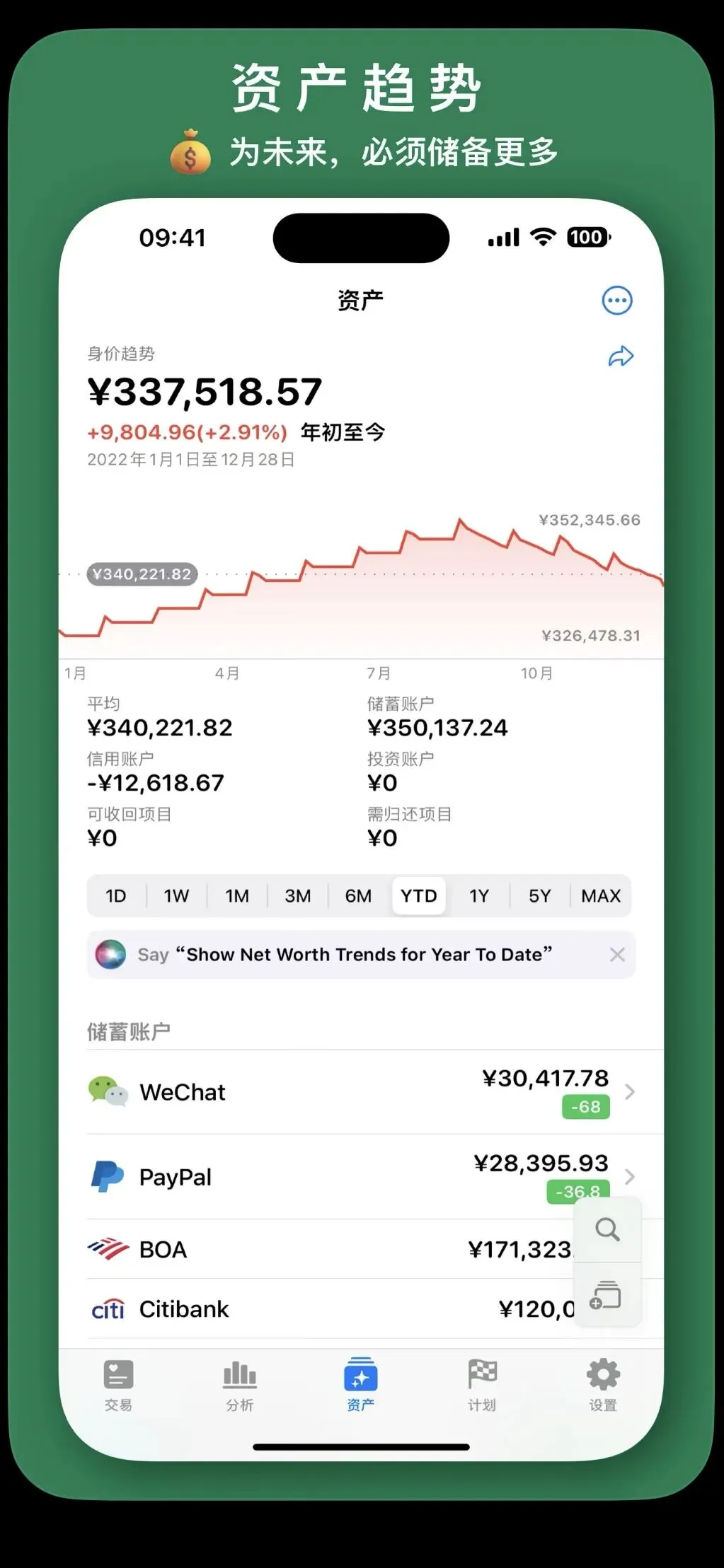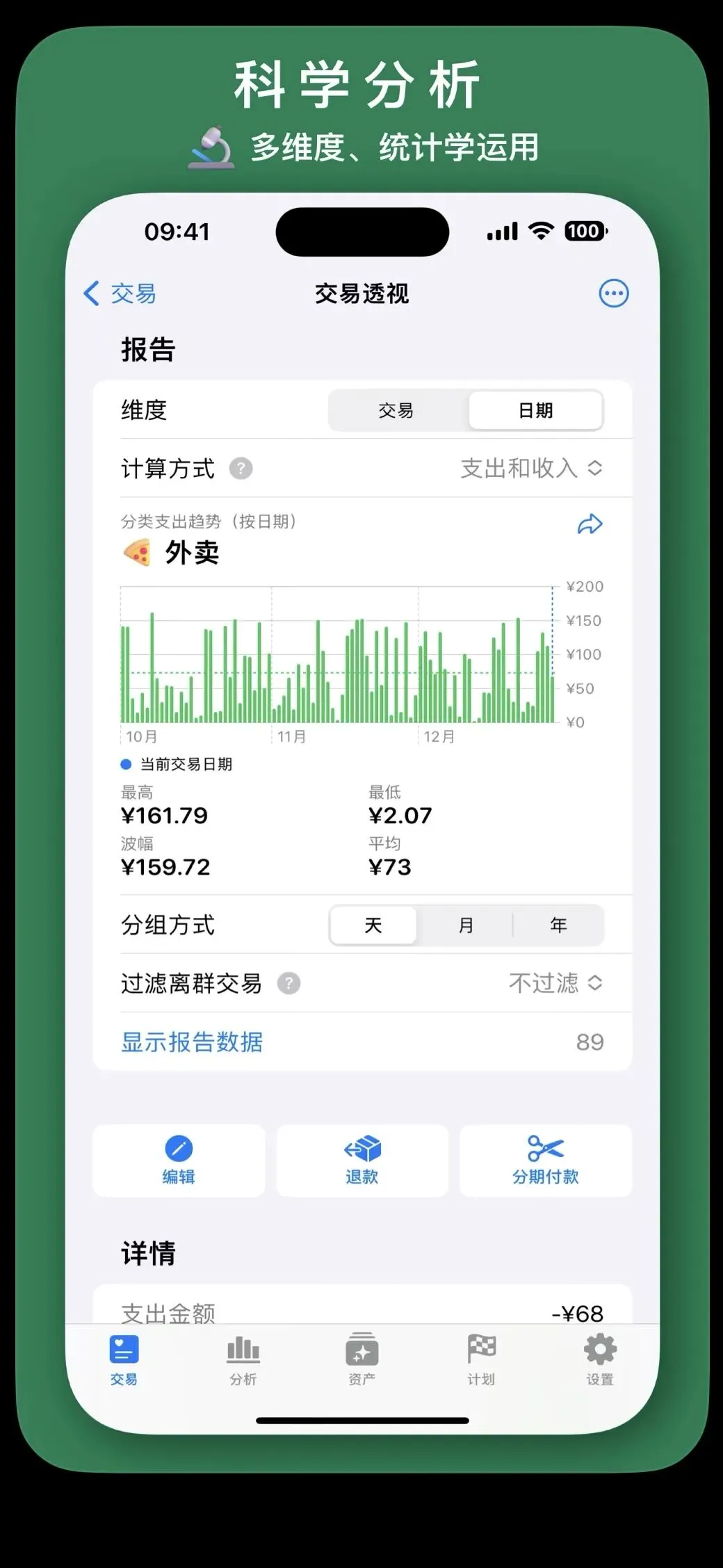 初始使用时可以按照自己目前的实际财务情况,创建自己的资产账户(包括储蓄、信用、投资账户三类),之后记录每一笔支出或收入时都可以关联到对应的交易账户,并且如果是组合付款的话还能够关联多个账户。它对账单的分析也一目了然,包括支出方块、折线图和饼图,能够从交易频率、趋势和类别三方面来帮你清晰地掌握自己的支出情况,如果是想要控制自己每月的开支,也可以用它设定计划(这属于高级版的功能了),目前基础功能对我来说已经够用,想要专业功能或和家人共享账本的话也可以订阅购买。