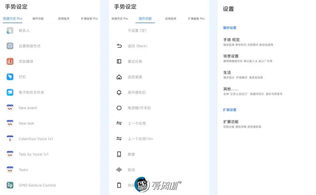 虽然是免费版,但它提供了齐全的触发功能项:快捷方式、app、各种实体和虚拟按键、甚至是负一屏和类似控制中心的拓展面板(调音量、亮度),任君选择。
