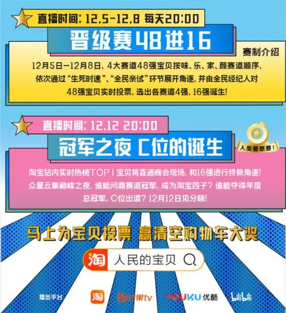 目前海选赛已结束、晋级赛开始、12.12总决赛《人民的宝贝总决选》在淘宝直播、芒果TV、优酷、B站继续同步上线,晋级的宝贝们将依次通过“生死时速”、“全民亲试”环节展开角逐!