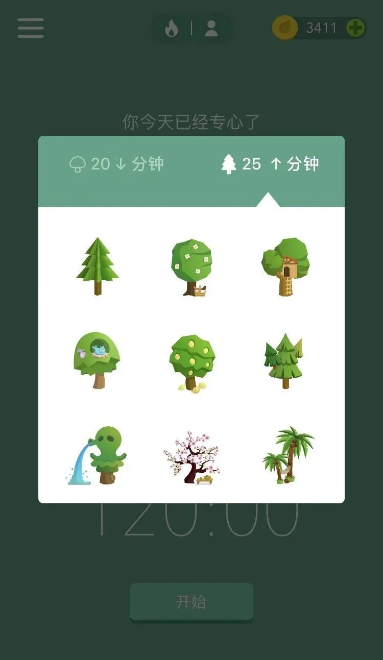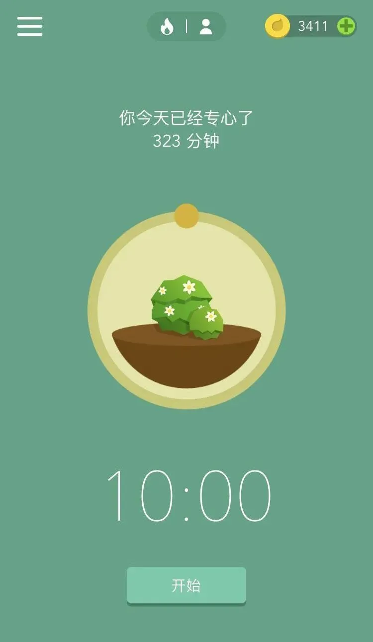 点击开始,便不能使用手机,可以设置专注的时间,最低可设置为10分钟,最高可设置为120分钟。只要在设定的时间内完成当下的专注任务,成功便能种下一棵树,失败便杀死一棵树,种植植物的时间可以兑换金币,金币可以解锁新的植物。