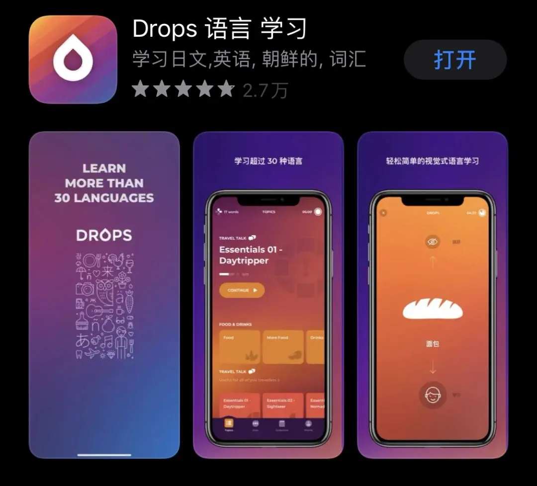 这是一款拥有33种学习语言的APP,每个单词都有对应的卡通图形设计,每天只需要五分钟的视觉化记忆,帮助大家轻松背单词。它里面还提供了趣味游戏式学习,比如拼图式拼写、连线式拼写、词义选择题、选择与单词匹配的图形、碰对式匹配题等,创造一个沉浸式外语学习环境,大大提高了大家背单词的效率。