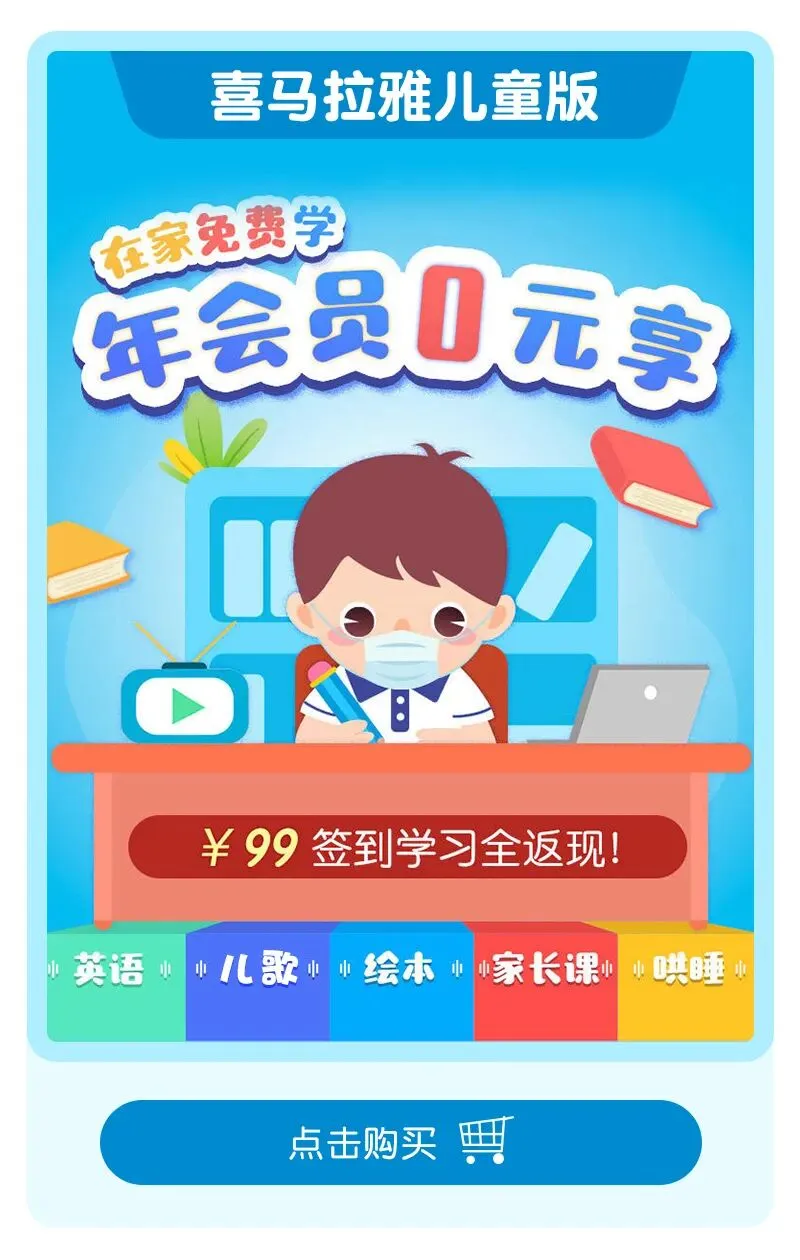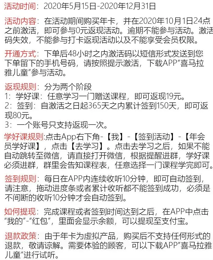 我为大家争取到的独家活动是打卡一年(实际满150天即可)+鹅妈妈童谣精讲课,组合价119元,其中年卡费用完成打卡后可返还,即:花20元即可购买喜马拉雅儿童版一年会员资格+原价49元的鹅妈妈英文童谣精讲课(视频版)。
