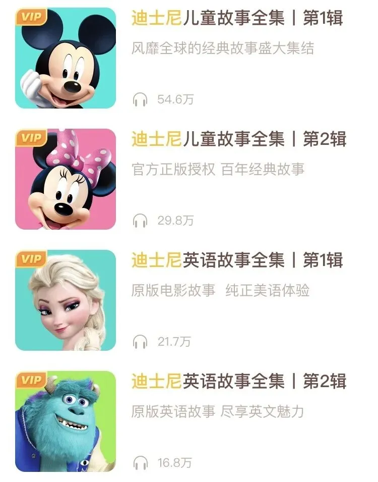 我很推荐它的原因是,这4套专辑是迪士尼的官方正版音频,都用的是原版小说文本,《儿童故事合集》是中文,《英语故事合集》是英文,可以根据孩子的情况自行选择。