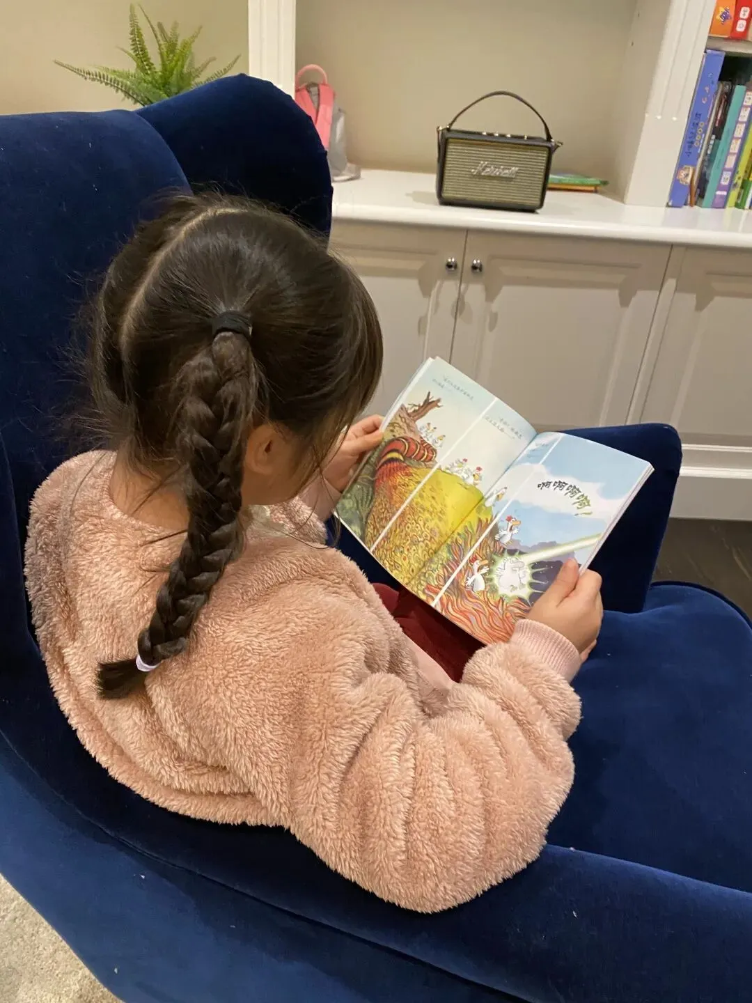后来我就从她熟悉的故事开始给她听,比如卡梅拉、神奇校车。一开始,我陪着她听,一起翻书,指着图、文,有时候还认字,有时候我插上几句,让她觉得和妈妈讲故事也没多大差别嘛……她越听越喜欢听,很快就愿意自己听故事了。