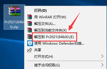 1.选中下载的【Pr2021(64bit)】压缩包,鼠标右击选择【解压到Pr2021(64bit)】。