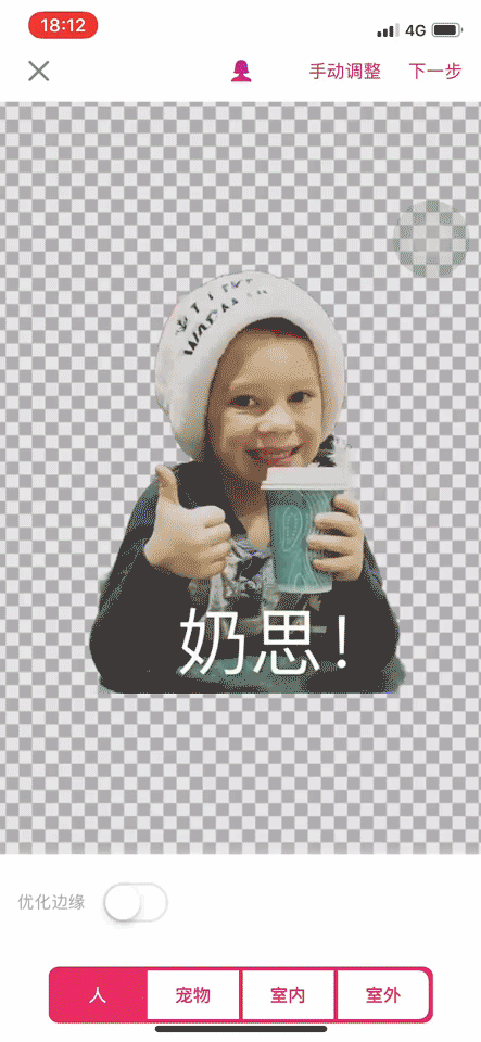如果还有部分边缘没有抠好的话,点击右上角的“手动调整”,在下方工具栏选中“擦除”,调整好画笔尺寸、偏移程度等后,用手指轻轻移动擦除掉多余的边缘。